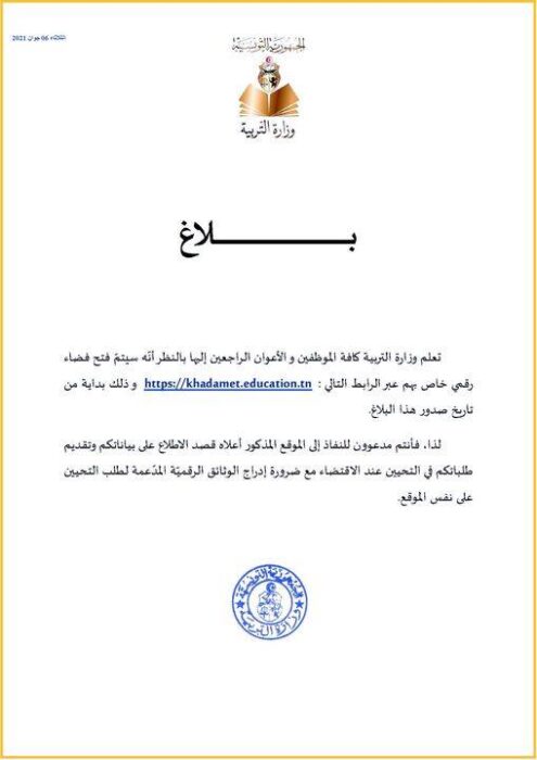 فتح فضاء رقمي خاص بالخدمات الادارية لكافة الأسلاك الراجعة لوزارة التربية عبر الرابط التالي : https://khadamet.education.tn