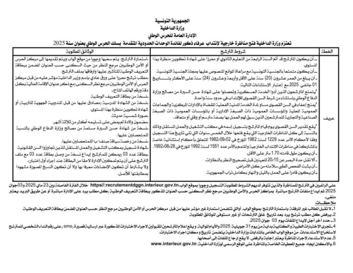 فتح مناظرة لإنتداب عرفاء بسلك الحرس الوطني : آخر أجل 03 جوان 2025
