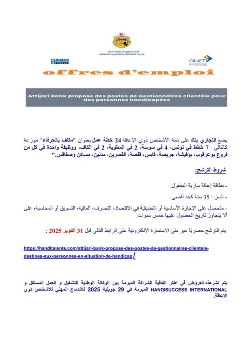 يضع التجاري بنك على ذمة الأشخاص ذوي الإعاقة 24 خطة عمل بعنوان « مكلف بالحرفاء » موزعة كالتالي