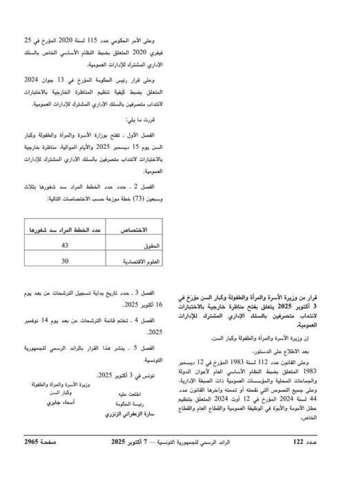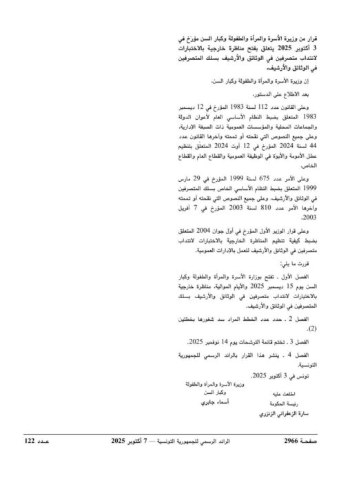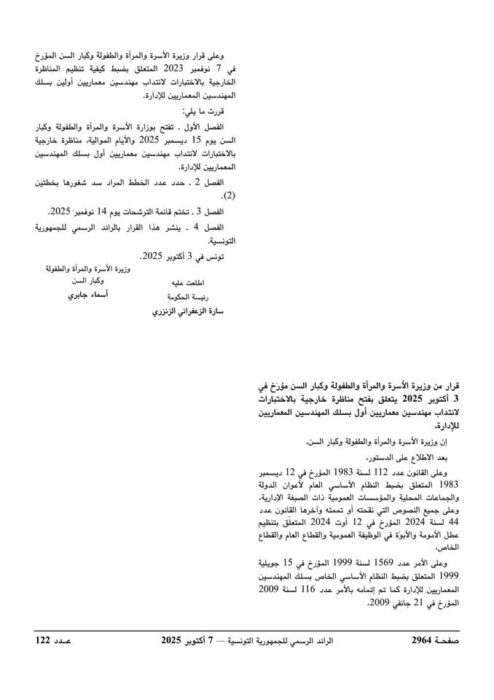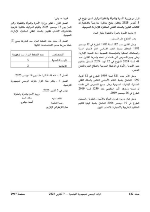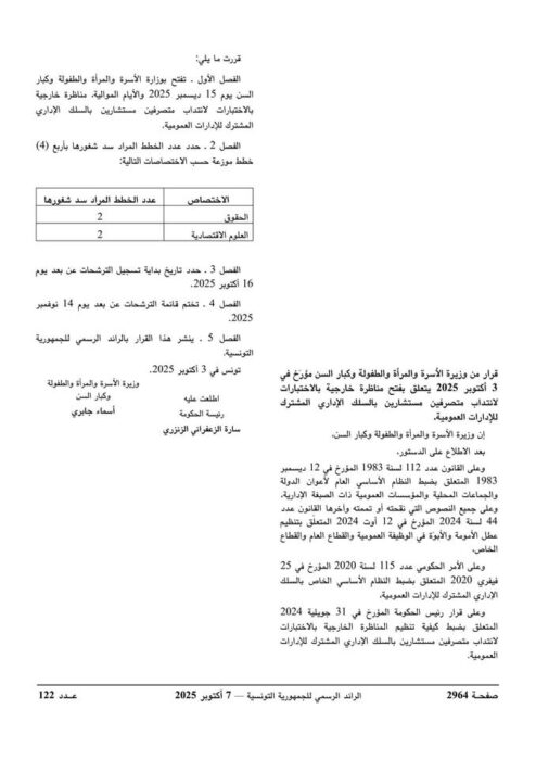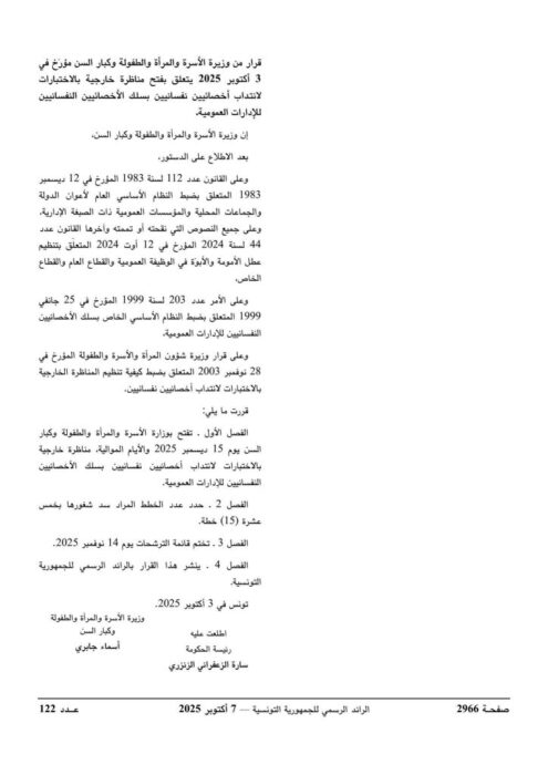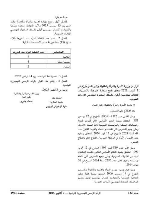 3 أكتوبر 2025 يتعلق بفتح مناظرة خارجية بالاختبارات الفصل الأول . تفتح بوزارة الأسرة والمرأة والطفولة وكبار