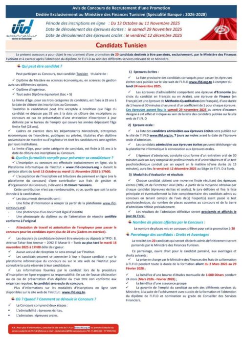إعلان فتح مناظرة إنتداب خاصة بوزارة المالية (تخصص بنكي: 2026-2028) – CONCOURS IFID