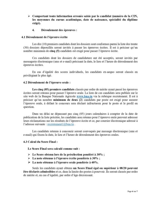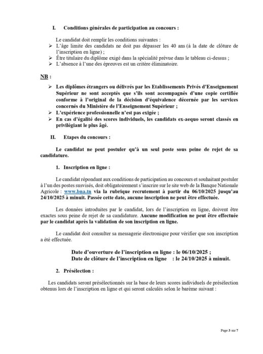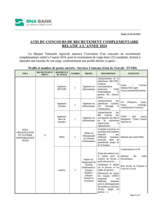 Agricole : www.bna.tn via la rubrique recrutement à partir du 06/10/2025 jusqu’au