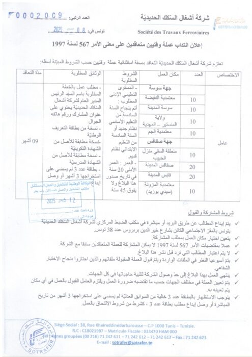 - كيفية التقديم: يتم إيداع مطالب الترشح إما عن طريق البريد المضمون الوصول أو مباشرة في مكتب الضبط المركزي للشركة. على سبيل المثال، عنوان شركة أشغال السكك الحديدية هو شارع خير الدين بربروس، عدد 38، تونس.