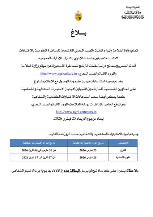 تعلم وزارة الفلاحة والموارد المائية والصيد البحري المترشحين للمناظرة الخارجية بالاختبارات لانتداب متصرفين بالسلك الإداري المشترك للإدارات العمومية أنه تم التصريح بنتائج دراسة ملفات الترشح للمناظرة المذكورة عبر موقع وزارة الفلاحة