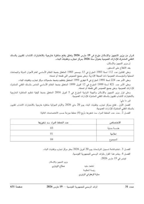 📢 صدر بالرائد الرسمي تعلن وزارة التجهيز والإسكان عن فتح مناظرتين خارجيتين بالاختبارات بعنوان سنة 2026، وذلك بمركز تجارب وتقنيات البناء، لانتداب أعوان في السلكين التقني والمشترك لمهندسي الإدارات العمومية.