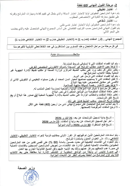 ينطلق التسجيل عن بعد بداية من يوم الإثنين 23 مارس 2026 إلى غاية يوم الأربعاء 22 أفريل 2026 عبر الموقع الإلكتروني التالي :