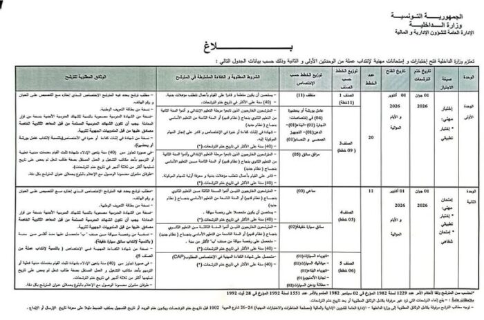 تعلن وزارة الداخلية – الإدارة العامة للشؤون الإدارية والمالية عن فتح مناظرات واختبارات مهنية خلال سنة 2026 لانتداب عملة من الصنفين الأول إلى الخامس، وذلك حسب الجدول الزمني والتوزيع التالي.